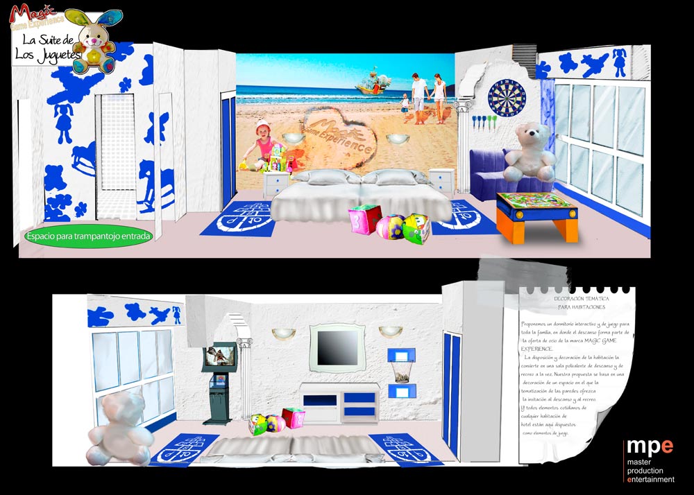 Hotel rooms will gradually be thematized until they become spaces for rest and play. Part of the hotel furniture will be progressively adapted to incorporate game elements to be enjoyed by couples and families.